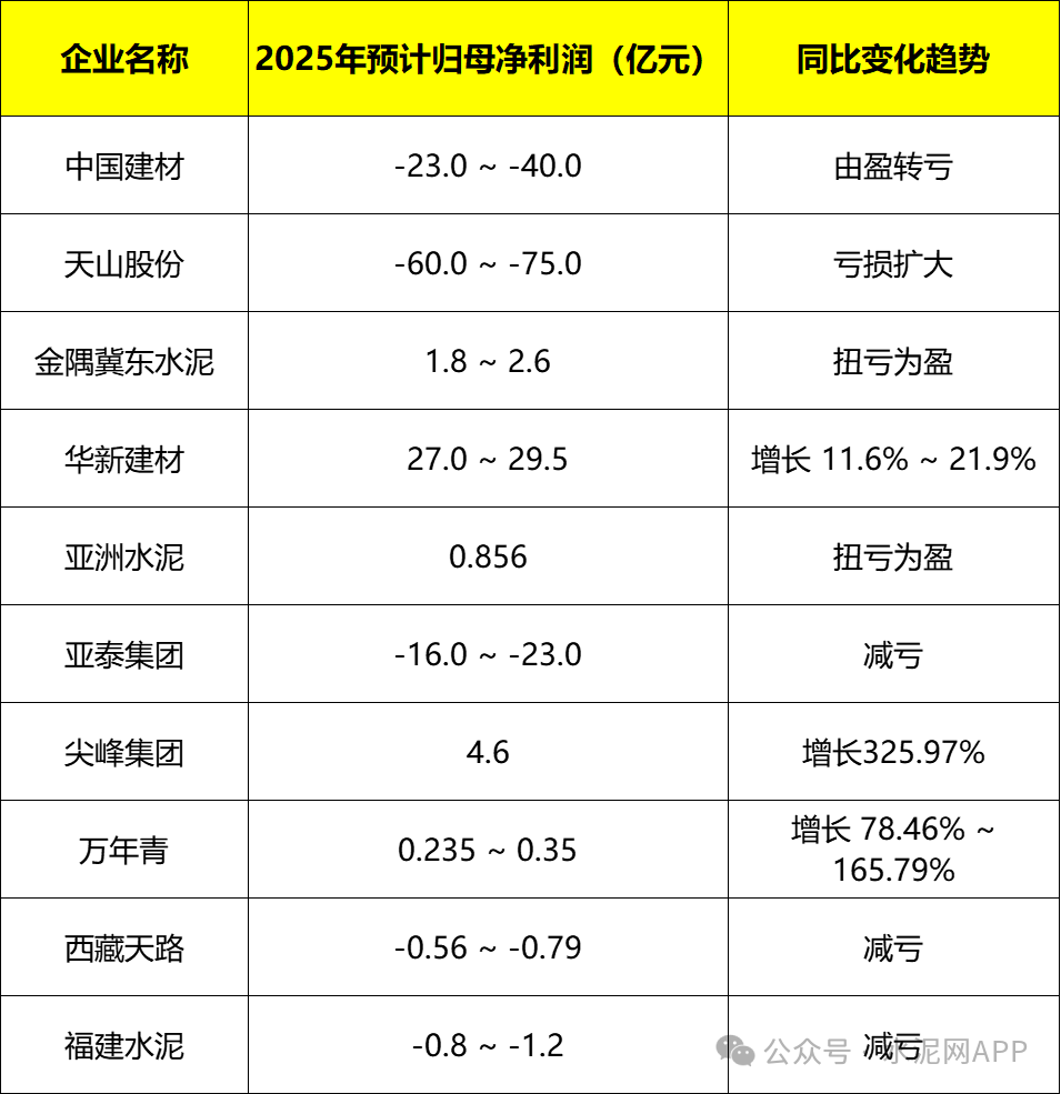 近日,多家水泥企業(yè)2025年度業(yè)績(jī)預(yù)報(bào)發(fā)布,具體見下: