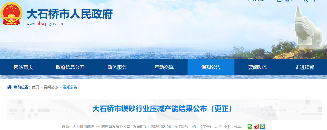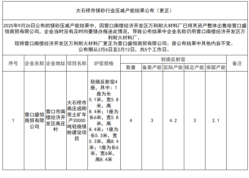 大石橋市鎂砂行業(yè)壓減產能結果公布(更正)